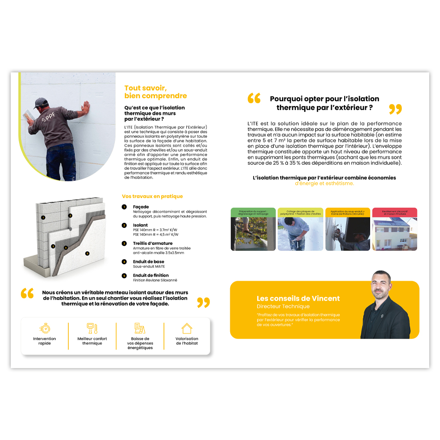 Une fiche explicative sur l’isolation thermique par l’extérieur (ITE), qui optimise l’efficacité énergétique et l’esthétique du bâtiment. Idéale pour mettre en avant une solution complète contre les ponts thermiques.