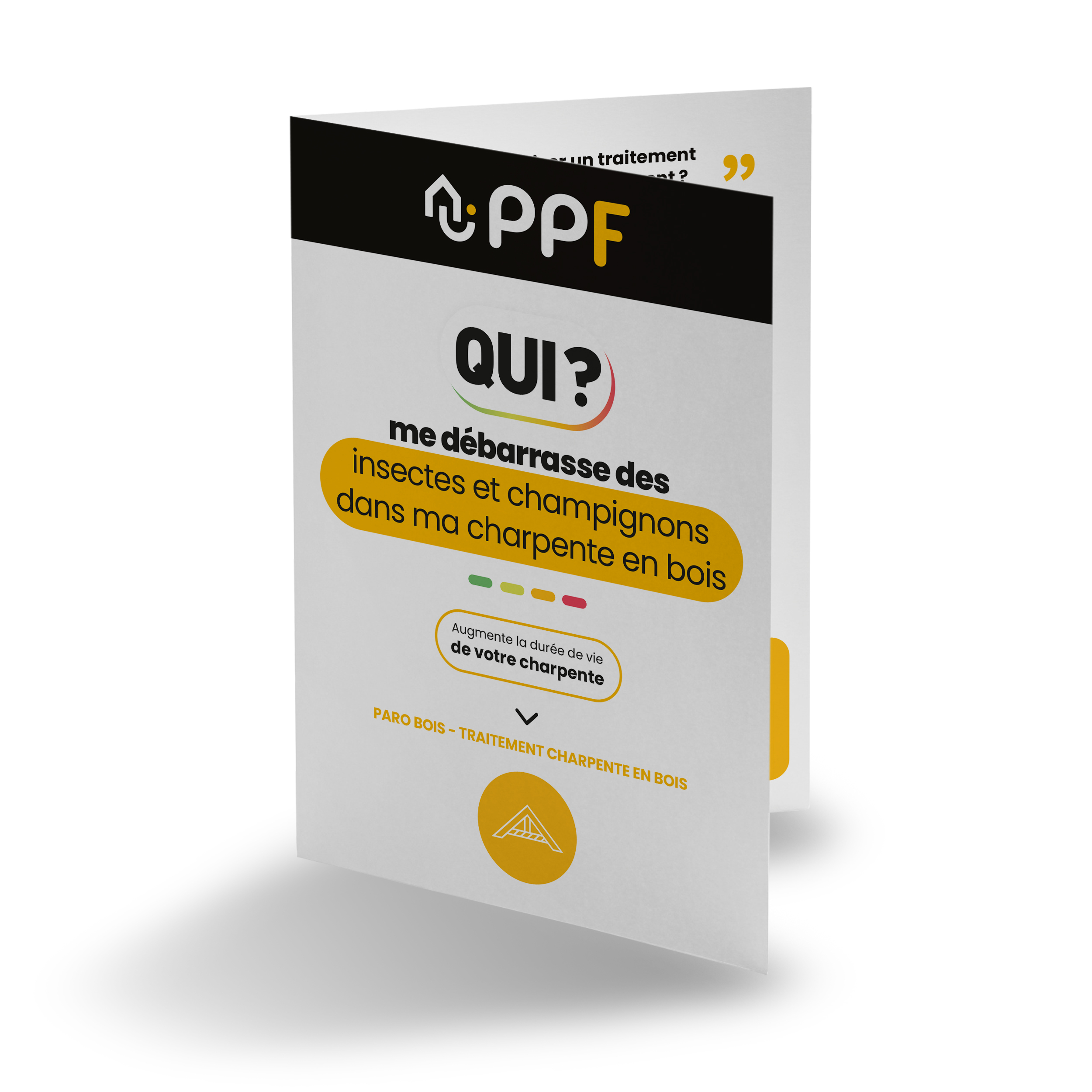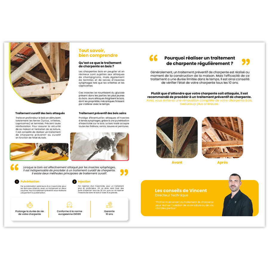 Renforcez l’impact de votre communication avec un prospectus dédié au traitement des charpentes en bois. Un support clair et informatif pour sensibiliser vos clients à l’entretien de leur structure tout en valorisant votre expertise.