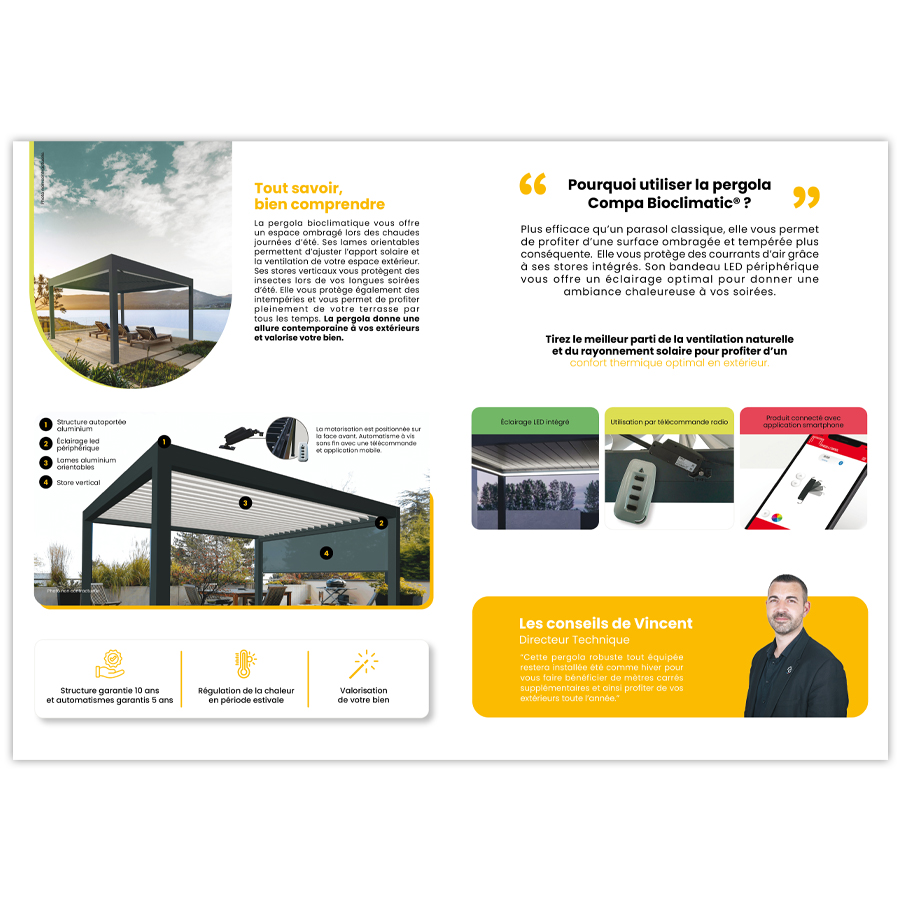 Fiche sur la pergola Compa Bioclimatic®, présentant une structure en aluminium avec lames orientables pour un confort thermique optimal. Idéale pour proposer une solution esthétique et fonctionnelle qui valorise les espaces extérieurs.