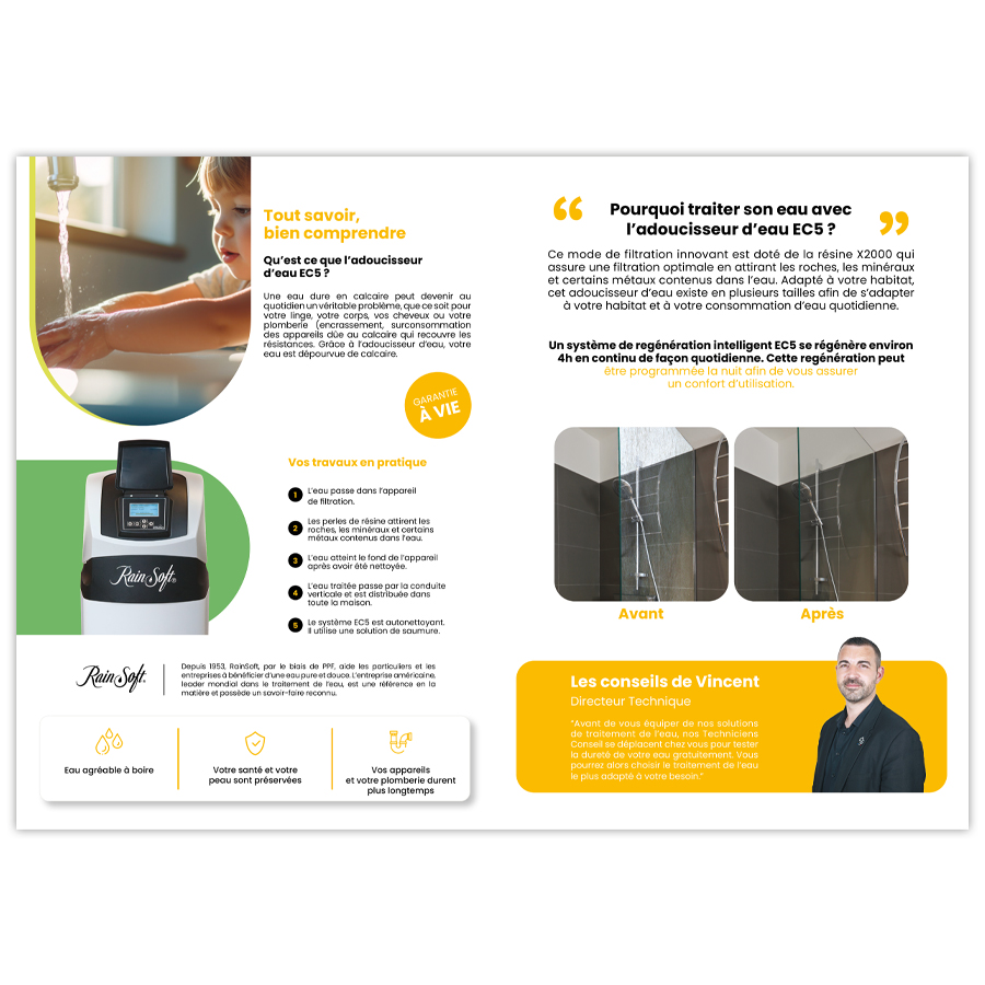 Fiche sur le traitement de l’eau EC5, présentant un adoucisseur efficace contre le calcaire. Idéale pour proposer une solution qui protège les appareils, améliore le confort de la peau et des cheveux, et assure une eau de qualité.