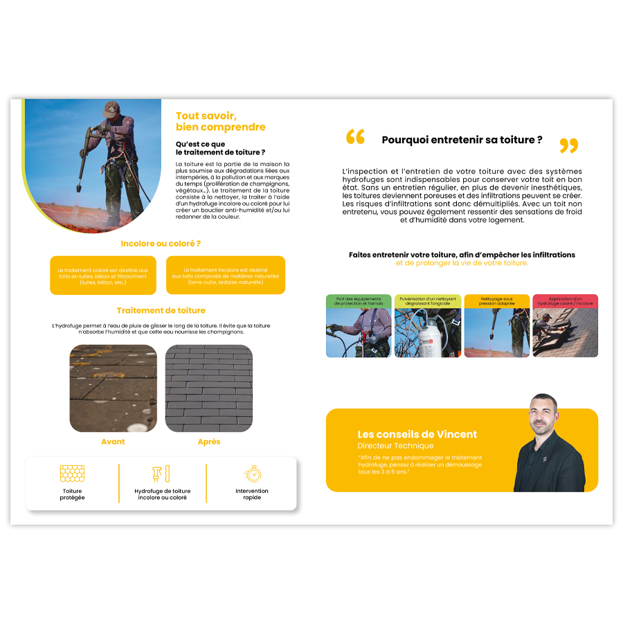 Fiche sur le traitement de toiture, détaillant un nettoyage et hydrofuge pour protéger durablement contre l’humidité. Idéale pour proposer une solution qui renforce la longévité et l’esthétique des toits.