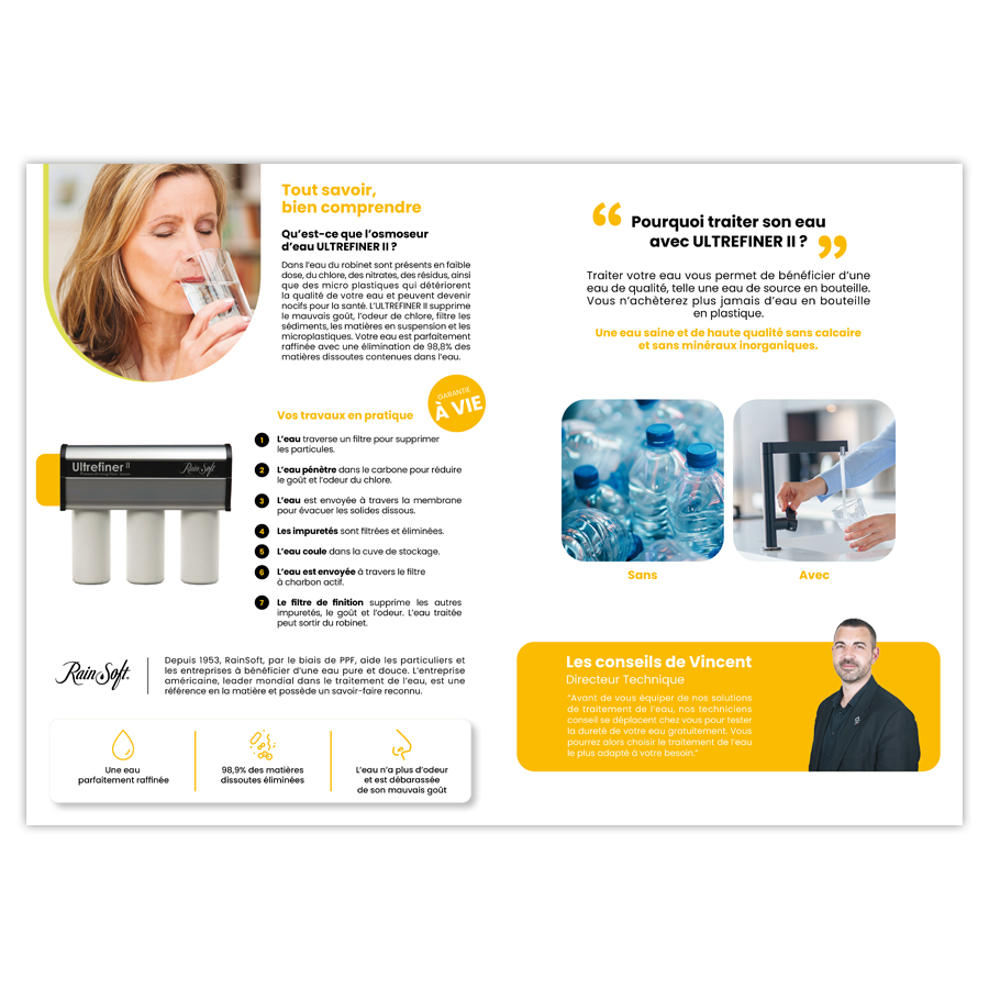 Cette fiche présente l’osmoseur Ultrefiner II, un système de purification avancé éliminant 98,9% des impuretés pour une eau potable pure et agréable. Parfaite pour mettre en avant une solution de filtration efficace et fiable.