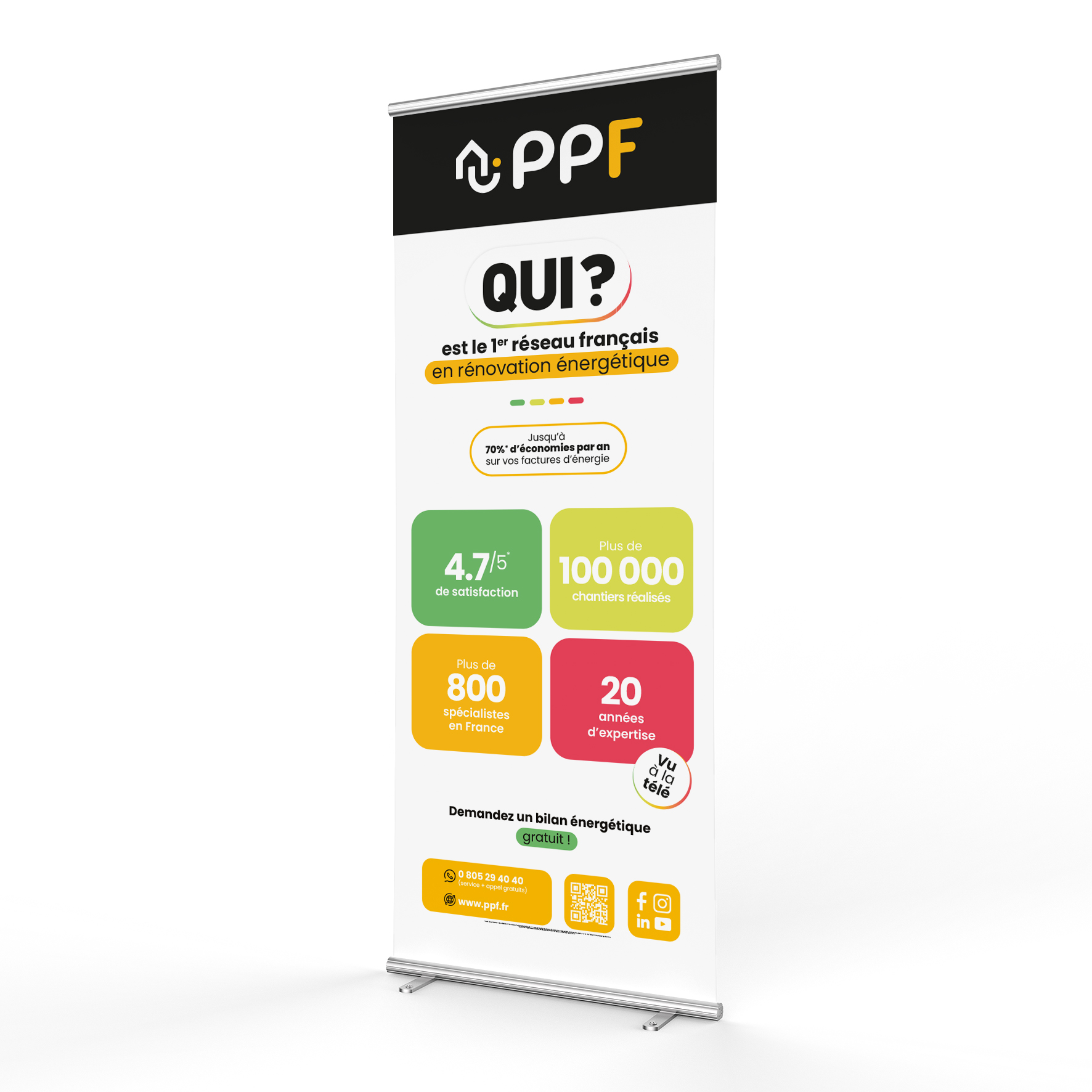 Renforcez votre communication avec un roll-up dédié au 1er réseau français en rénovation énergétique. Un support visuel impactant pour mettre en avant votre expertise, votre expérience et les économies d’énergie réalisables. Idéal pour les salons et points de vente, il est livré avec une sacoche de transport pour une installation simple et rapide.