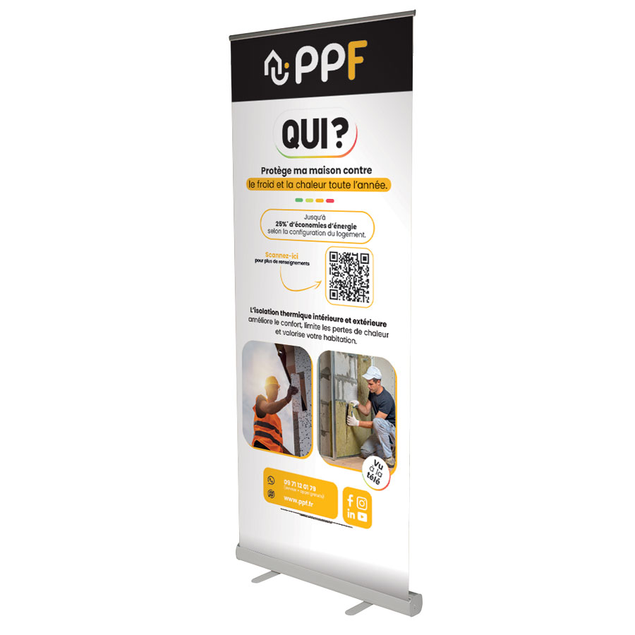 Conçu pour être installé directement chez vos partenaires (magasins, showrooms, agences, artisans…), ce support permet de promouvoir facilement le service PPF auprès de leur clientèle. Avec ses visuels attractifs, il invite les visiteurs à scanner en un geste pour découvrir les offres PPF et lancer leur projet. Un moyen simple et efficace d’augmenter la visibilité de votre partenariat tout en générant des leads qualifiés. Léger, stable et livré avec sa housse de transport, il s’installe en quelques secondes pour une communication professionnelle et autonome chez chacun de vos partenaires.