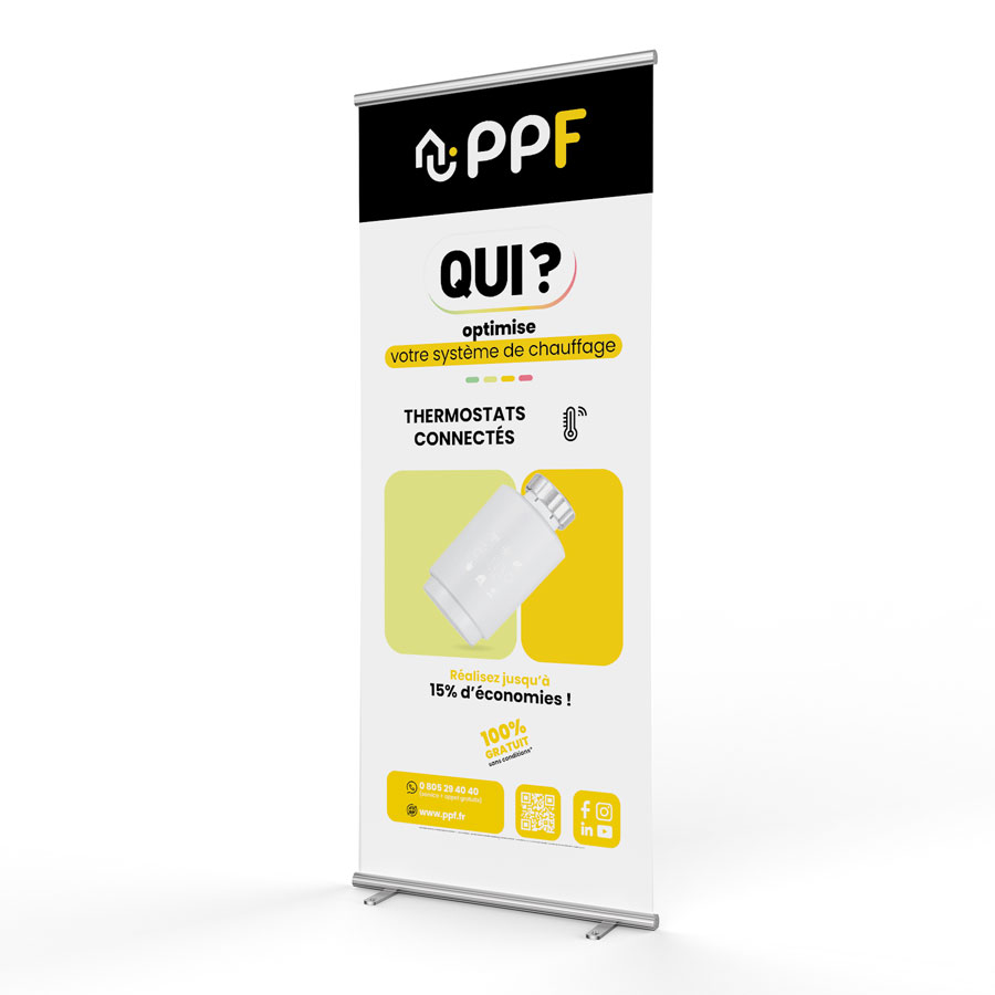 Renforcez votre communication avec un roll-up dédié aux thermostats connectés. Un support visuel impactant pour mettre en avant l’optimisation du chauffage et les économies d’énergie réalisables. Idéal pour les salons et points de vente, il est livré avec une sacoche de transport pour une installation simple et rapide.